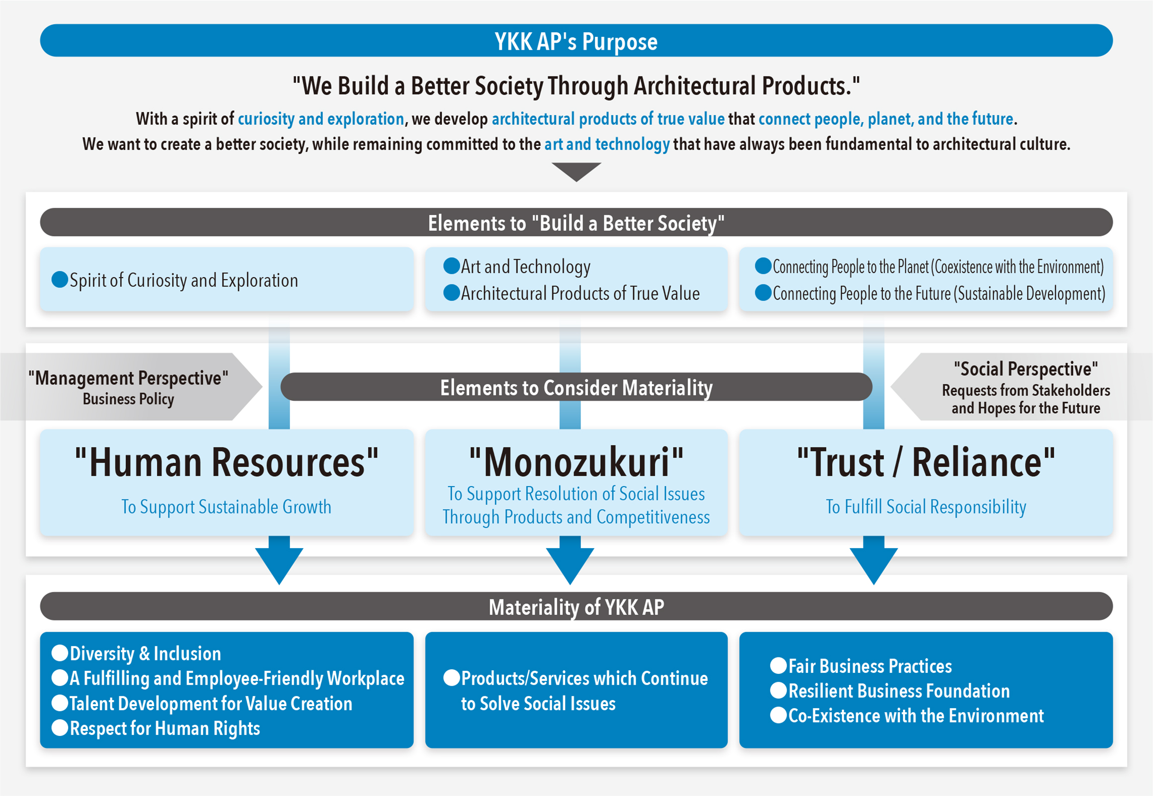 To drive YKK APʼs sustained growth, we have conducted a review of our Materiality (Priority Issues) in FY2024 based on our Purpose. We have established a system for promoting Materiality and are further advancing specific initiatives by setting KPIs.