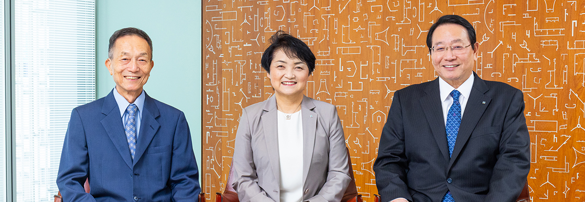 A three-way discussion between Hidemitsu Hori, YKK AP Chairman Representative Director, and Chairman of the Board, Tomoko Inoue, Outside Director, and Keinosuke Ono, YKK Outside Director. They discussed the implementation of governance essential for corporate growth at YKK AP.