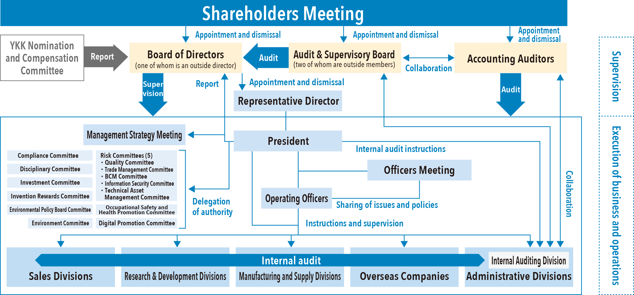 Underlying YKK AP’s corporate activities is the YKK philosophy ― CYCLE OF GOODNESS®, which states that "no one prospers without rendering benefit to others." Accordingly, we have consistently made fairness the foundation of all our business activities. In line with this approach, we aim to enhance our corporate governance system with the goal of further increasing corporate value. Based on an organizational system in which the Board of Directors serves as the decision-making and supervisory body and the Audit & Supervisory Board serves as the auditing body, YKK AP has adopted an Operating Officer System to promote the execution of business and operations.