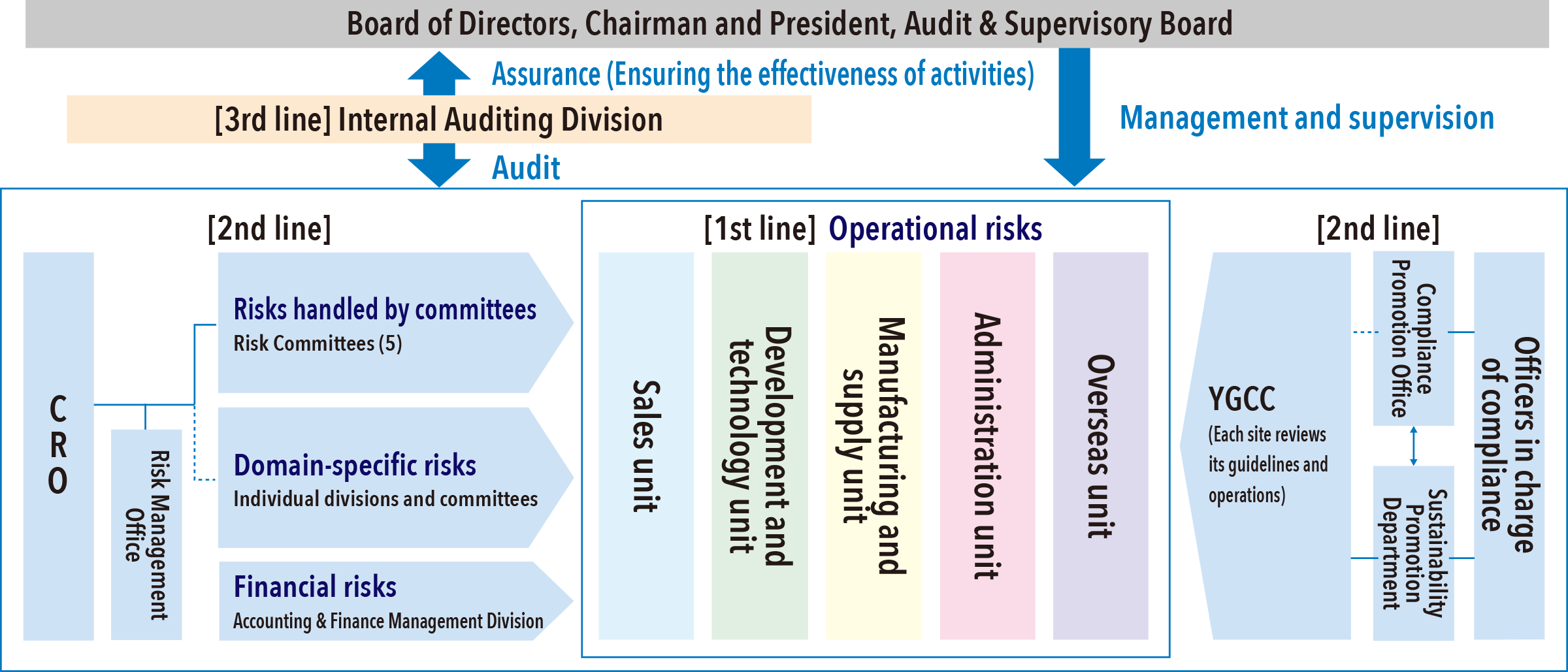 YKK AP’s risk management promotion structure is based on a three-line model. The five basic units (Sales, Development and technology, Manufacturing and supply, Administration, and Overseas) serve as the first line, taking the lead in risk management activities. Risk management departments and committees, which serve as the second line, support the first line with their specialized knowledge and expertise. The Internal Auditing Division, which serves as the third line, audits the effectiveness of the risk management activities of the first and second lines. Furthermore, by allowing self-checks of risk management activities based on the YKK Group’s compliance standards, the YKK Global Criteria of Compliance (YGCC), we are clarifying the roles and responsibilities of each person and division in charge of conducting these activities, thereby enhancing their effectiveness.