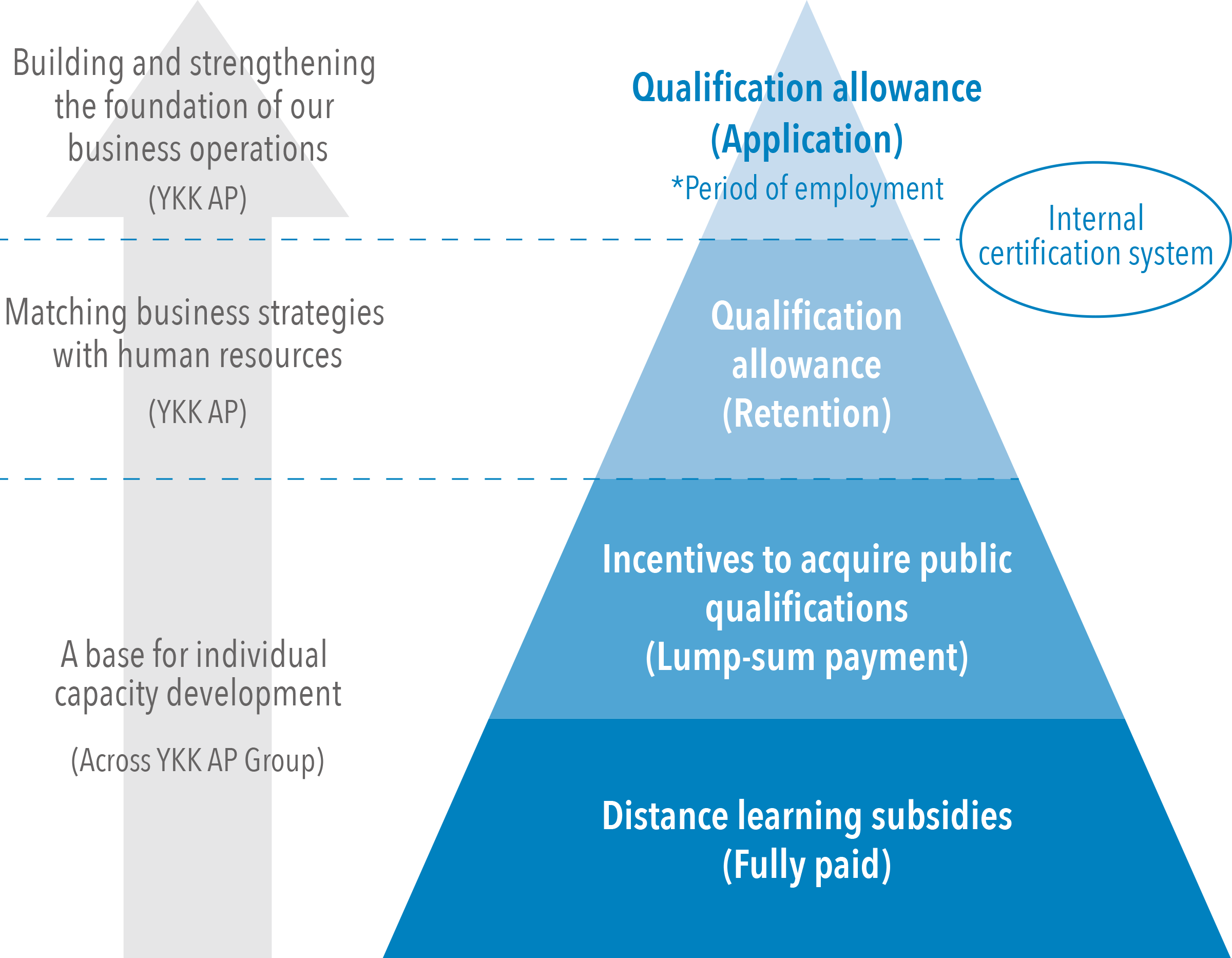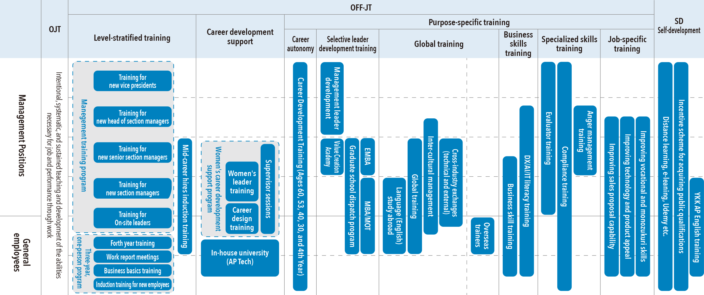 Based on the idea of "autonomy and coexistence," YKK Group creates systems and environments in which each and every employee can demonstrate their full potential, regardless of age, gender, educational background, and so on. The goal is to create a "Forest Organization," a company in which every employee has a consciousness of being a manager, and grows strongly together as a group, like a forest that is made up of individual trees. To create value as such an organization, we work to develop human resources and achieve truly fair personnel systems.