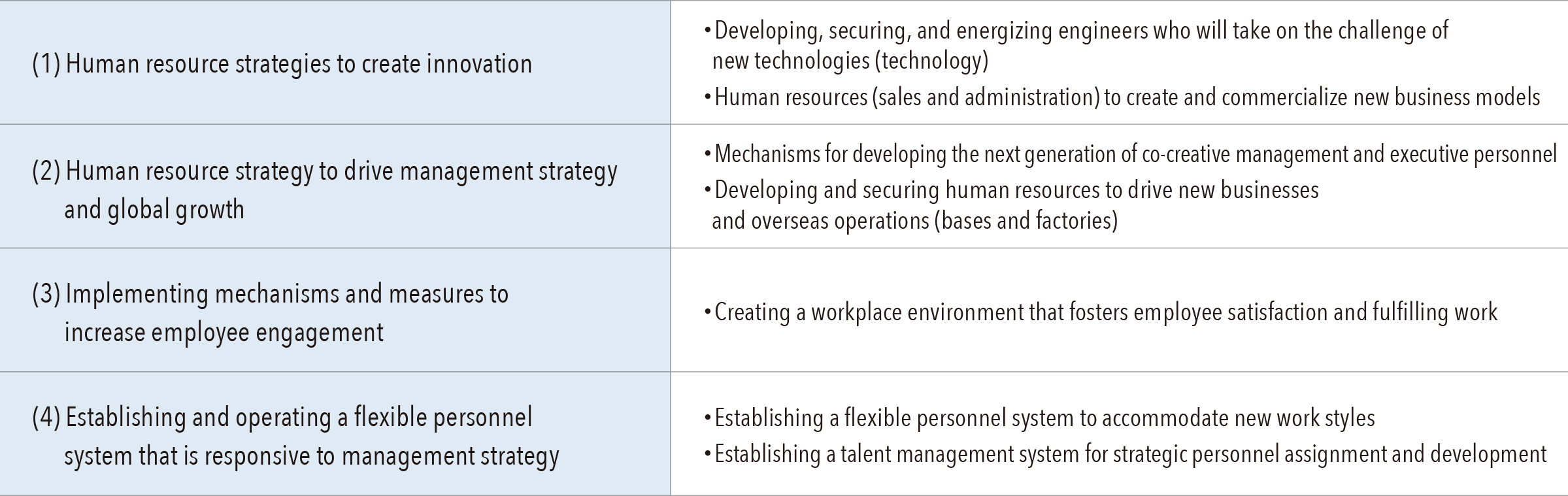 In terms of (1), making the workplace employee-friendly, we are promoting varied work styles and diversity & inclusion by strengthening the efforts of the Work Style Reform Committee and the Workplace Improvement Committee. For (2), investing in talent, in addition to existing training programs, we are restructuring our education system to foster creativity and conceptual improvement and to develop global human resources. (3), providing growth opportunities, involves strengthening support for individual career formation and development. Finally, in terms of (4), creating job opportunities, we will improve our personnel system and operations, increase the take-up rate of annual paid leave, and implement measures to strengthen recruitment.