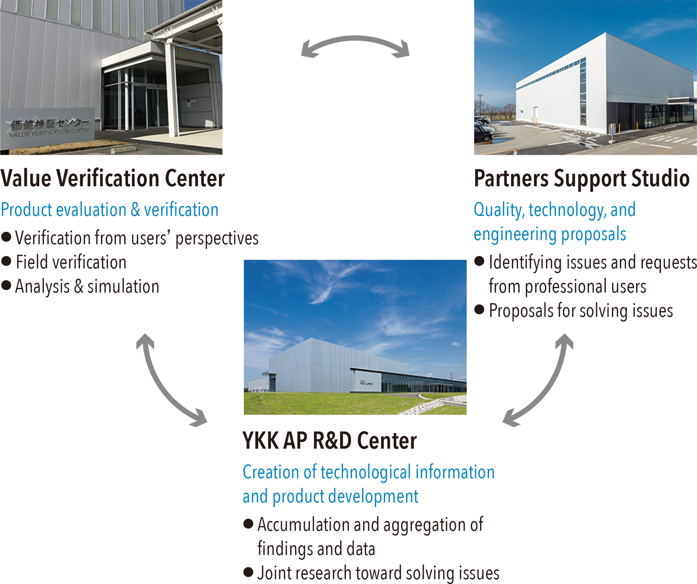 The YKK AP R&D Center, Value Verification Center, and Partners Support Studio, all located in Kurobe City, Toyama Prefecture, are responsible for the cycle of development, evaluation and verification, technical proposals, and information communication that form the foundation of YKK AP's monozukuri process. The YKK AP R&D Center is a center of technology and expertise which develops high-quality products. The Value Verification Center conducts "user verification" using consumer monitors and "field verification" that reproduces the natural environment. Finally, the Partners Support Studio presents proposals aimed at addressing the issues of professional users, based on our technology. Furthermore, the Central Testing Center Laboratory, a JNLA testing laboratory that meets international standards, reinforces our product quality assurance system through rigorous testing.