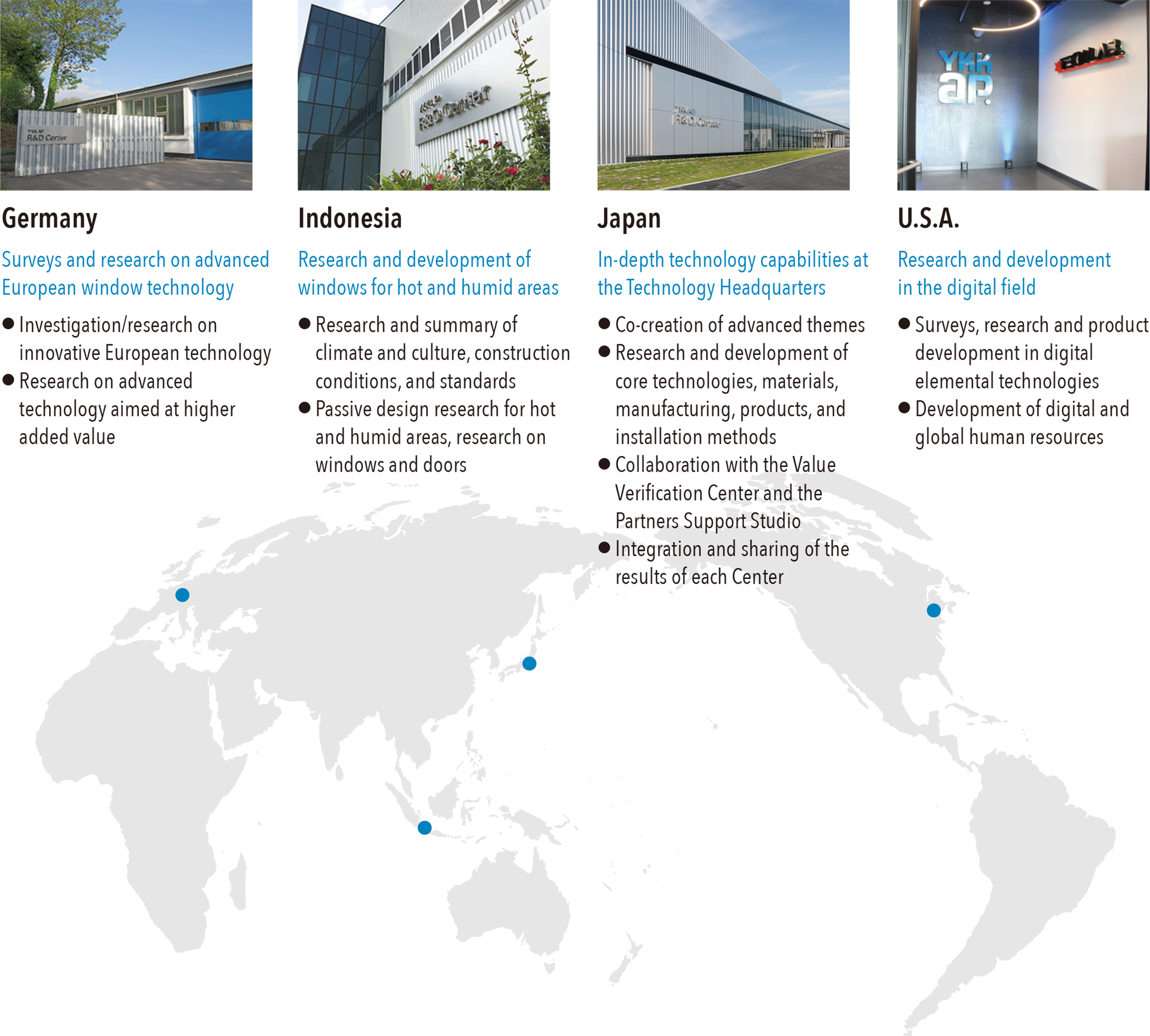 YKK AP has also strengthened its global research and development system. In addition to Japan, R&D centers have been established in Germany and Indonesia to conduct research and studies in different regions: Japan for warmer regions, Germany for colder regions, and Indonesia for hot and humid regions. Information specific to these different climates is compiled and shared to develop products optimally suited to each region. Additionally, YKK AP Technologies Lab (NA) in the U.S.A. has also established "xTech Lab (cross-tech lab)," a research & development center for the digital field.