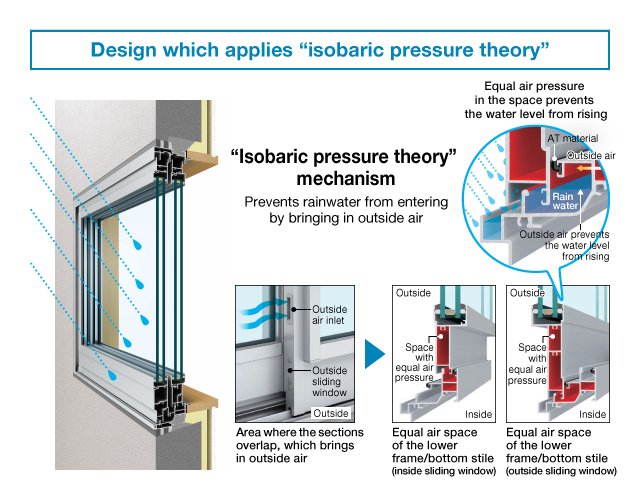 YKK AP has developed high watertight performance for double-sliding windows, combining multiple technologies to achieve superior watertight performance. As a basic principle of window design, we focused on the characteristic that air moves from a place of high atmospheric pressure to a place of low atmospheric pressure. The window’s design applies the "isobaric pressure theory," which keeps the air pressure inside the window frame at the same level as the air pressure outside, to suppress the force of water attempting to flood the window. Specifically, air pathways called outside air inlet are placed where the frames overlap, as well as the lower part of the frame. The inside of the window frame is designed to have almost the same air pressure as the air pressure outside to prevent rainwater from entering and keep the water level in the lower frame from rising.