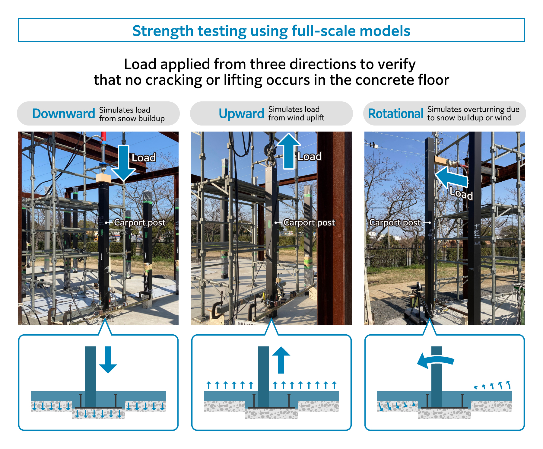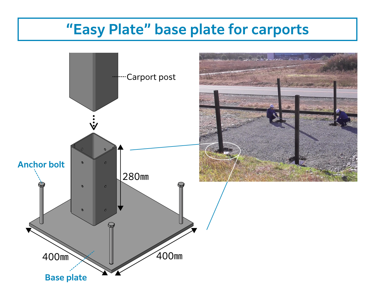 This led to the development of a new installation method, in which the concrete floor itself serves as the foundation. This method involves installing the "Easy Plate" specialized column base plate onto the bottom of the carport’s posts, then pouring and setting the concrete floor on top. This transfers the vertical, horizontal, and lateral loads acting on the base to the floor itself. This allows sufficient strength to be achieved even with shallow excavation.
