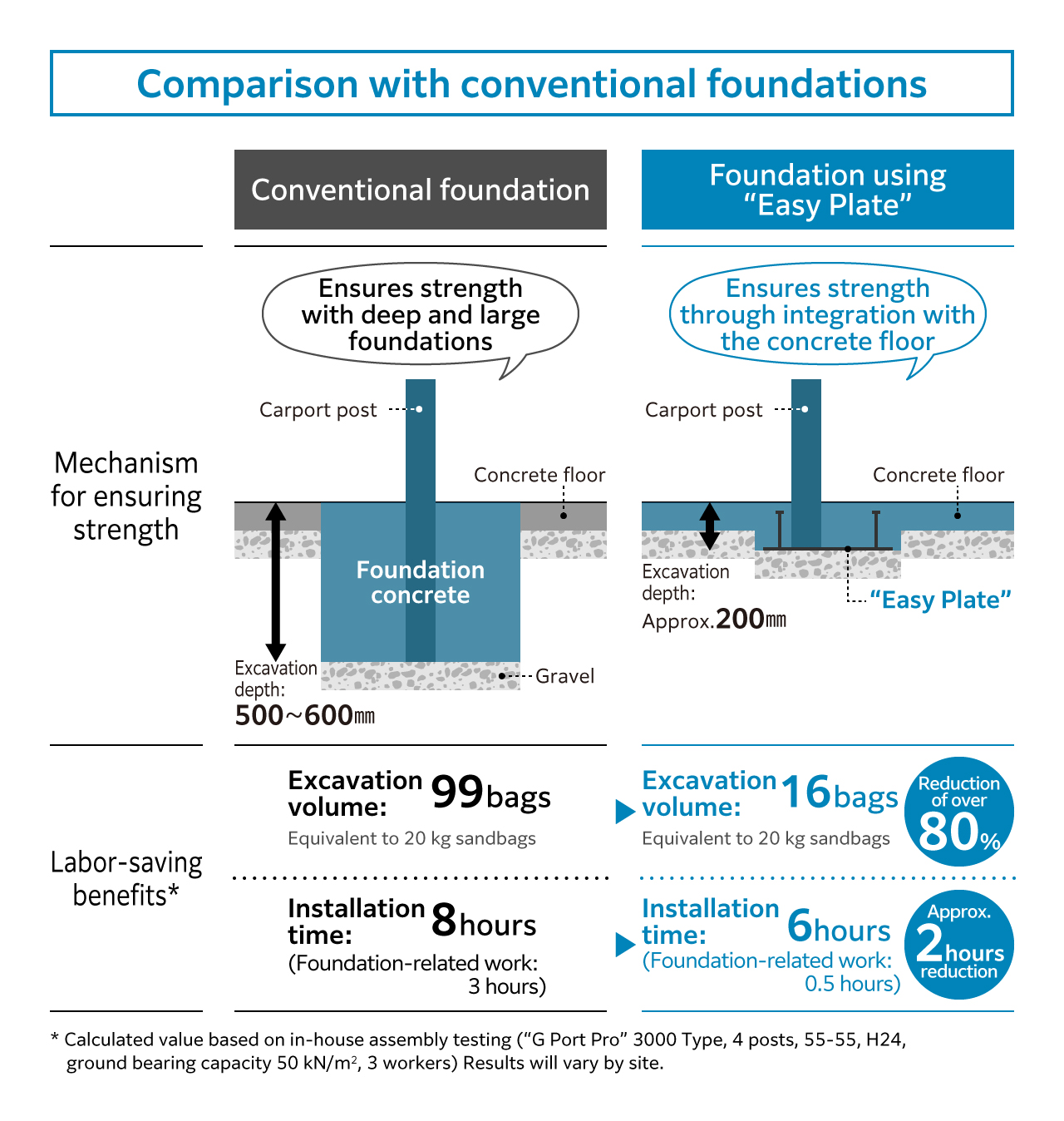 Installation using the "Easy Plate" offers significant benefits in terms of labor saving. First, because it allows the size of the foundation itself to be reduced, it cuts down on the effort required for excavation and the disposal of excavated soil. Compared to conventional methods, foundation excavation and soil disposal time is reduced from 148 minutes to 31 minutes, and foundation pouring time is reduced from 29 minutes to 0 minutes—a total reduction of 146 minutes. This also reduces excavation volume and leftover soil volume by approximately 80%.*