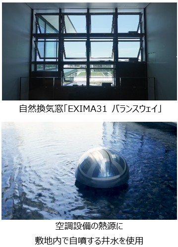 水環境では敷地内に自噴する井水を空調等に利用。黒部川扇状地の地下水が年間を通して豊富で安定した水温であるため、空調設備の熱源に井水を使用して高い省エネ効果を発揮しています。また、創エネ技術として太陽光発電を導入しエネルギーを創出。これらの取り組みにより、年間のエネルギー収支をゼロ以下に設計しています。