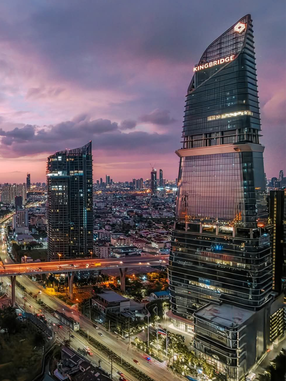 タイ・バンコクの南西エリア、プミポン橋の端付近にそびえるKingBridge Towerは、タイ最大のコングロマリットであるサハグループの複合開発プロジェクトの一環として建設された、グローバル企業のビジネス拠点ニーズを満たすオフィスビルです。効率性・幸福感・バランスを融合し、グローバル基準に準拠した高い環境性能と安全性を備えています。