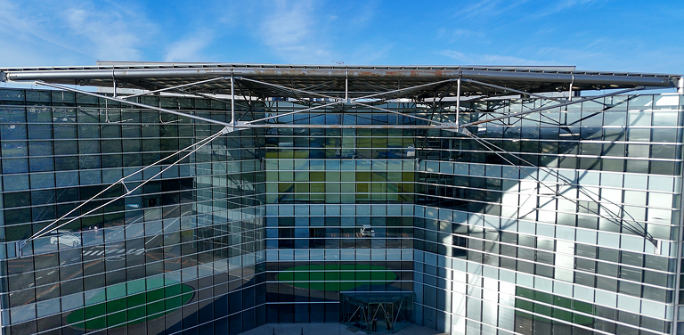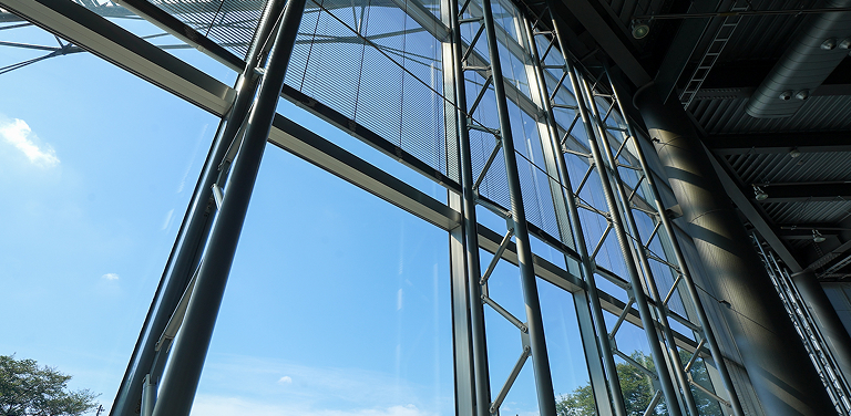 45mの大スパンガラス屋根 や、細部まで露わになった結合部は、高度な技術が持つ本来の美しさを提示。