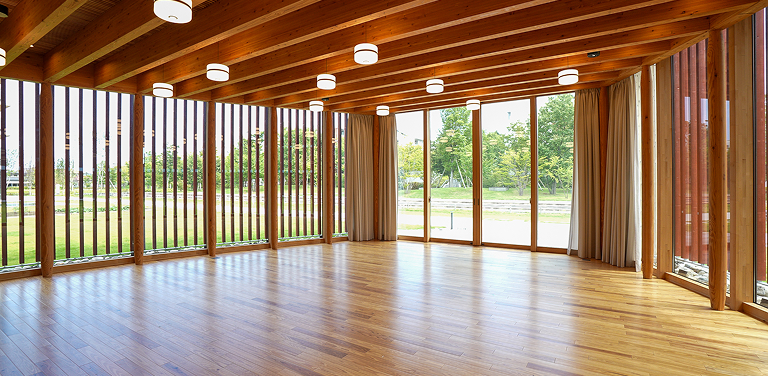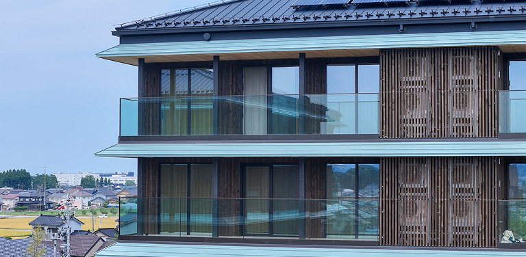 集大成となる第5街区は、富山県産材を約9割使用した北陸初の木造中高層集合住宅です。地元の森林資源を循環させると同時に、春から秋にかけての太陽光発電の電力を水素に変えて水素吸蔵合金に貯蔵し、発電量が少なく電力消費量がピークとなる冬のエネルギーとして活用するシーズンシフトで年間を通じたエネルギー自立を目指すなど、黒部の四季と共に生きる次世代の暮らしを体現しています。